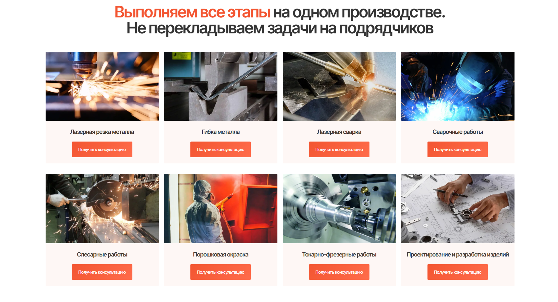 “Лазерная резка — точно по ТЗ”, “Гибка металла — без потерь точности”, “Порошковая окраска — под сертификаты.”