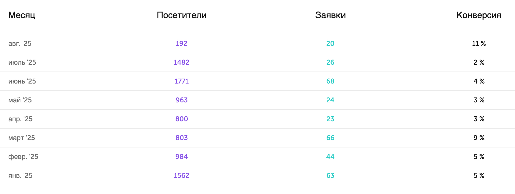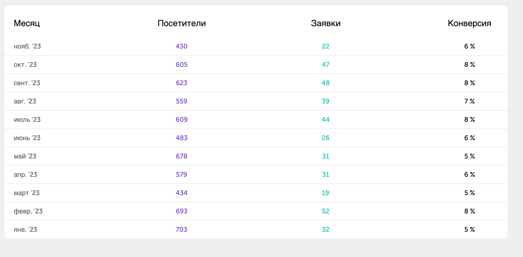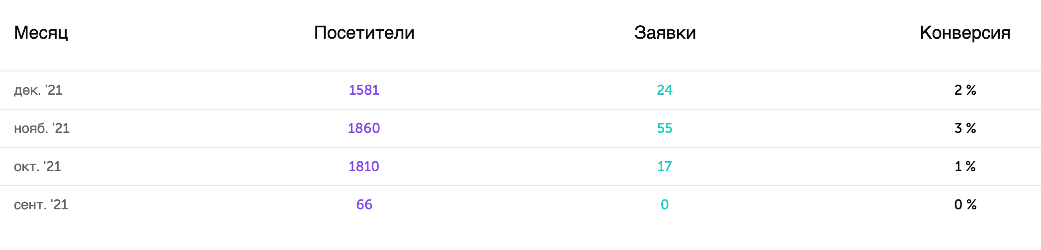 Важно! Здесь учитываются только заявки из форм на сайте. Обращения на почту и звонки на телефон ведутся отдельно, поэтому суммарно у клиента более 100 обращений каждый месяц
