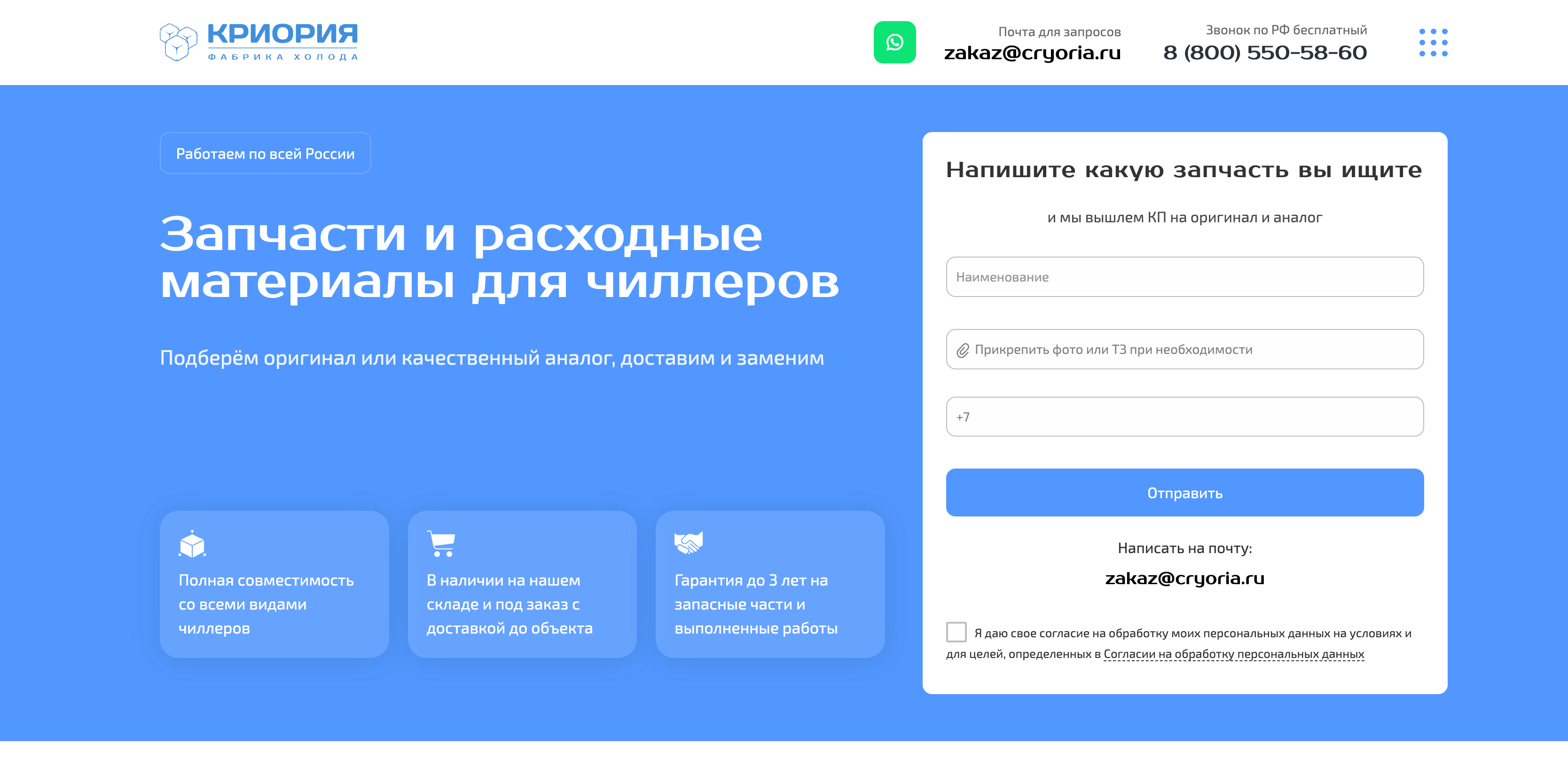 КРИОРИЯ работает с 2014 года: проектирует, монтирует и обслуживает промышленные системы охлаждения для фармацевтических предприятий, пищевых производств, заводов и других объектов. За это время компания установила более 500 систем и ведёт 30+ действующих сервисных договоров по всей России. Второе направление — продажа запчастей и расходных материалов: фильтры, хладагенты, компрессоры, теплообменники.