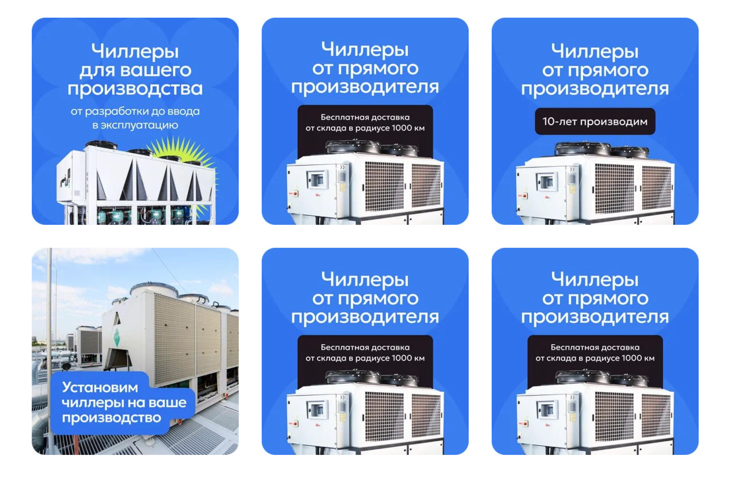 В заголовке ушли от технических характеристик в сторону задачи клиента: не «промышленные чиллеры», а «Чиллеры для вашего производства — от разработки до ввода в эксплуатацию». Дополнительно вынесли в объявление ключевые условия — мощность от 1 кВт до 4 МВт, гарантия 18 месяцев, доставка до 1 000 км бесплатно. Это снимает возражения ещё до перехода на сайт.