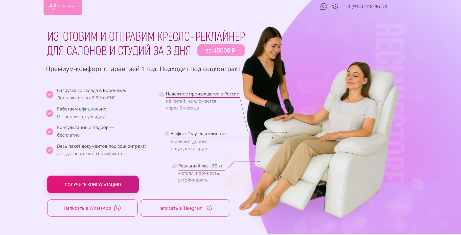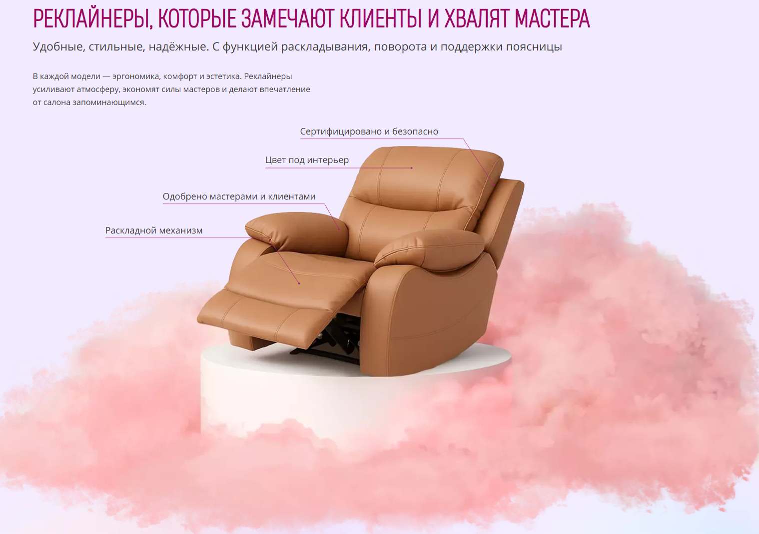Компания Reclinestore — производитель кресел-реклайнеров для салонов красоты, косметологических студий, массажных кабинетов и мастеров, работающих по соцконтракту.