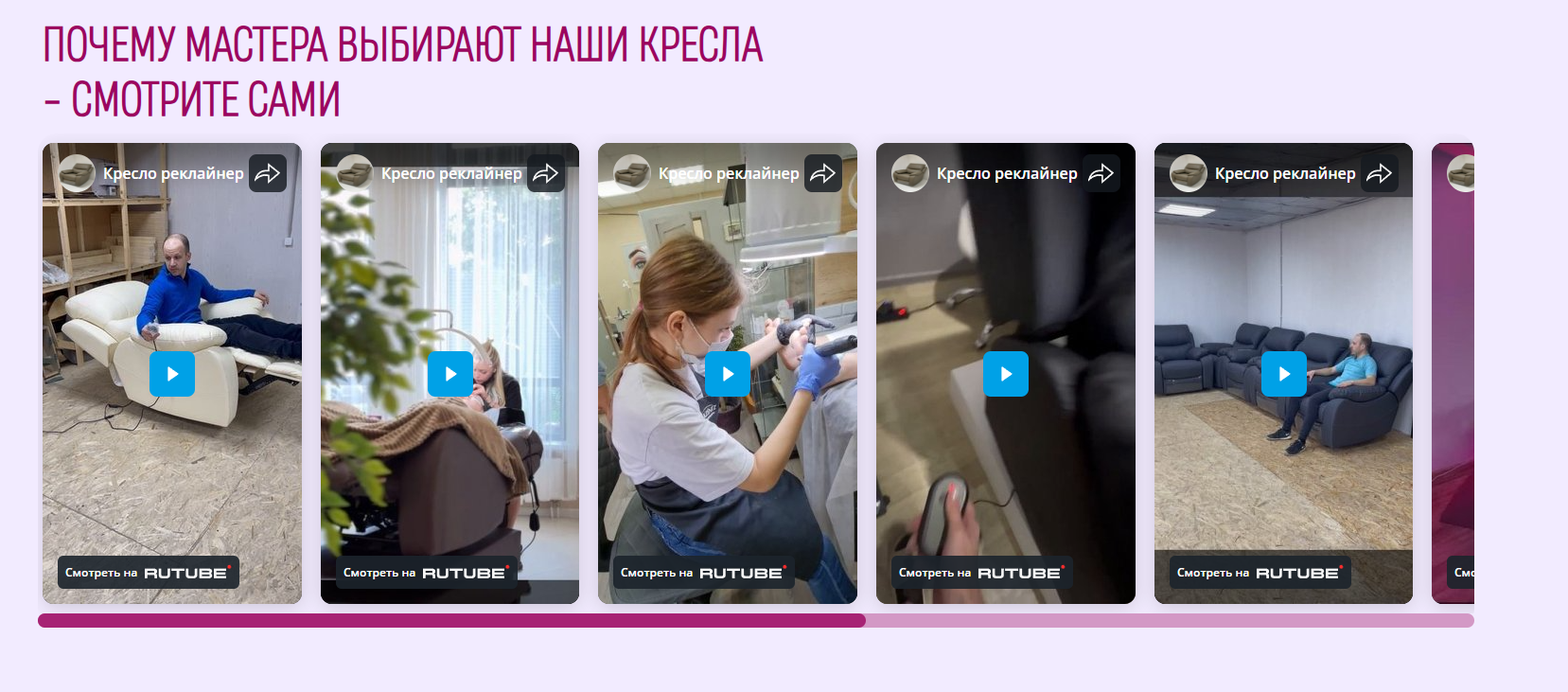 Добавили видео с Rutube-канала клиента, где мастера показывают кресла в работе — это создало эффект “живого бренда”.