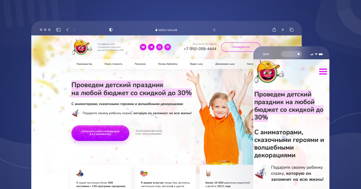 Арбуз Шоу – компания, специализирующаяся на организации детских праздников в Москве. Клиент обратился с задачей увеличить количество заявок на мероприятия, снизить стоимость привлечения клиентов и протестировать рекламу в Яндекс.Директ.