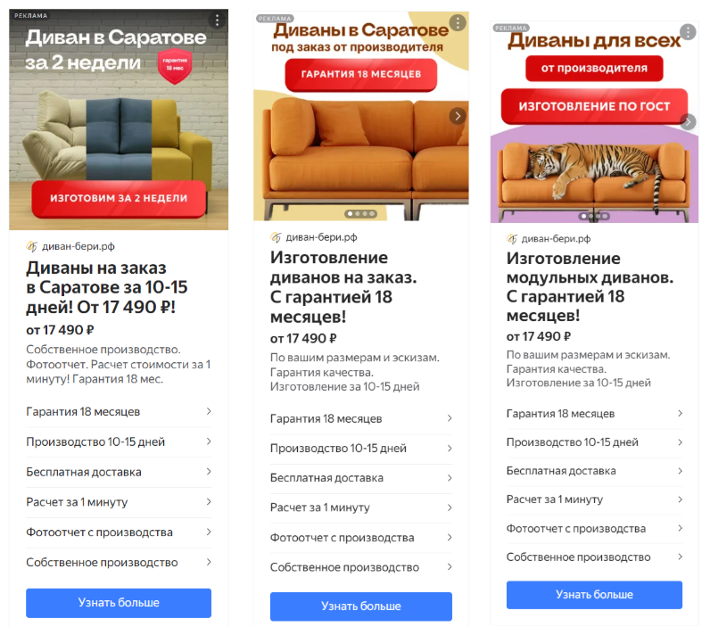 Они получились просто шикарные. Они хорошо пробивали баннерную слепоту за счёт красного цвета, идеально раскрывали, что у нас есть диваны разной жёсткости. Ну и отличались интересной подачей, что не могло оставить равнодушным любителей кошачьих.