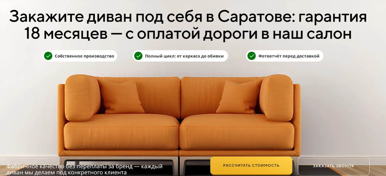 На первом экране сразу вынесли сильный оффер: «диван под себя в Саратове», гарантия 18 месяцев и фишка с оплатой дороги до салона, плюс две понятные кнопки «Рассчитать стоимость» и «Заказать звонок». Это нужно, чтобы человек не думал и не искал, что делать дальше.