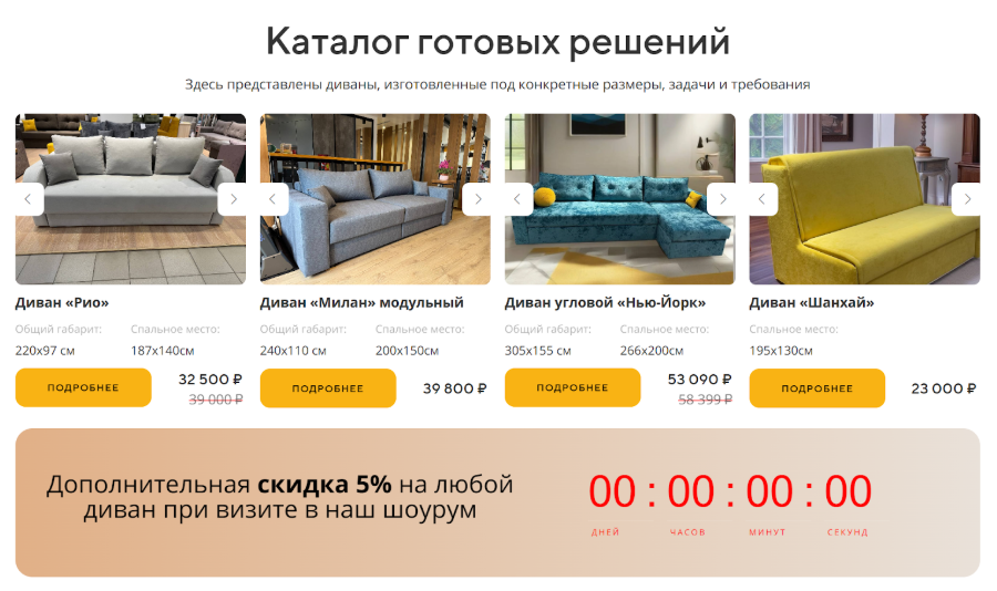 Естественно на старте обязательно добавили галерею, чтобы пользователи могли зацепиться взглядом за какой то диван и захотеть его.