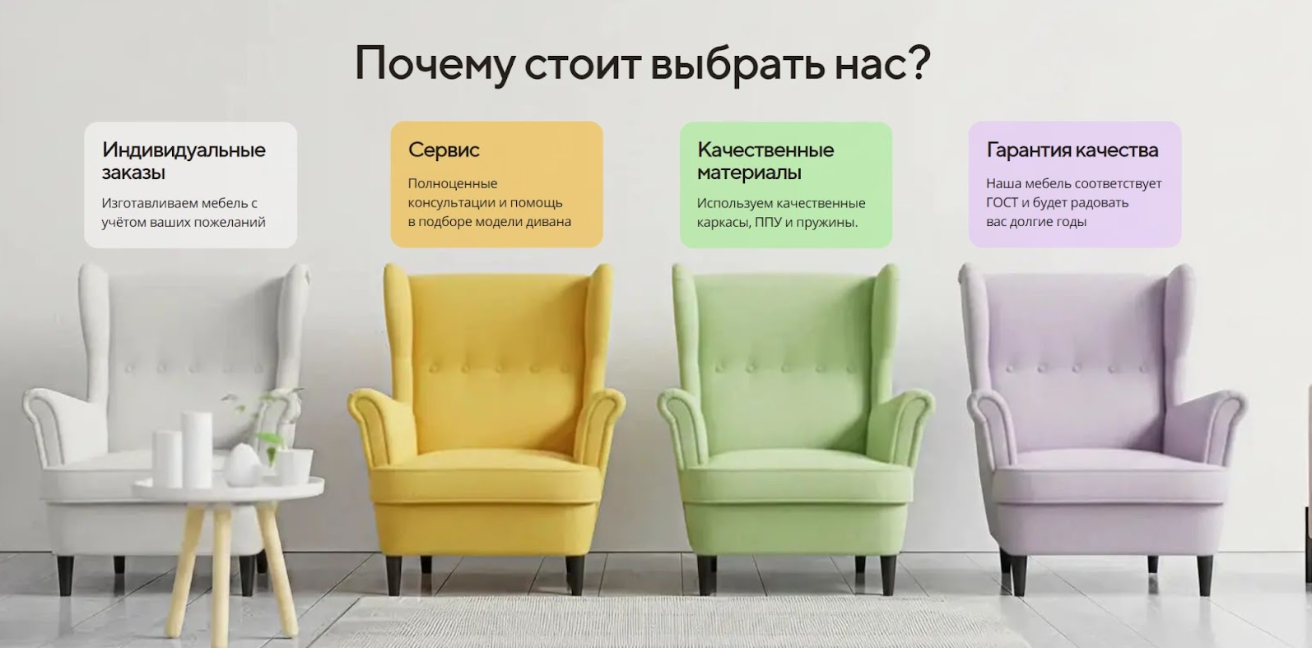 Дальше усилили доверие блоком «Почему стоит выбрать нас?»: индивидуальные заказы, сервис/помощь с выбором, качественные материалы и гарантия качества. Визуально сделали аккуратно: воздух, крупные заголовки, цветовые акценты — чтобы не выглядело как «типовой мебельный сайт».