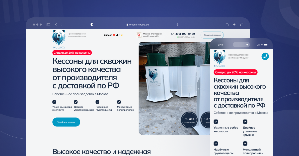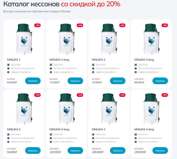 Блок «Каталог» на сайте кессонов «Мишка» — это не просто перечень продукции, а стратегический инструмент для привлечения и удержания клиентов. В B2B-продажах важна простота выбора, а строительные компании, подрядчики и оптовые клиенты хотят сразу видеть варианты, характеристики и условия заказа.