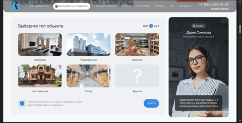 Чтобы не пугать человека голой формой «Имя + телефон», мы встроили квиз-калькулятор из 4 шагов, который ведёт к расчёту. Вопросы простые: тип объекта, примерная площадь, состояние проводки, дополнительные пожелания. По окончании человек получает ориентир по стоимости, а мы контакты и понимание задачи.