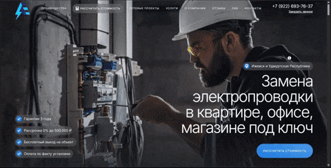 Мы начали с нуля: спроектировали структуру, написали текст и собрали отдельный лендинг на Creatium под услугу замены электропроводки. Первый экран сразу отвечает на главный вопрос: что делаем, для кого и чего можно ожидать по цене и срокам. На видимом поле конкретное обещание, телефон и понятная кнопка для расчёта стоимости, а не абстрактное «оставьте контакты мы перезвоним».