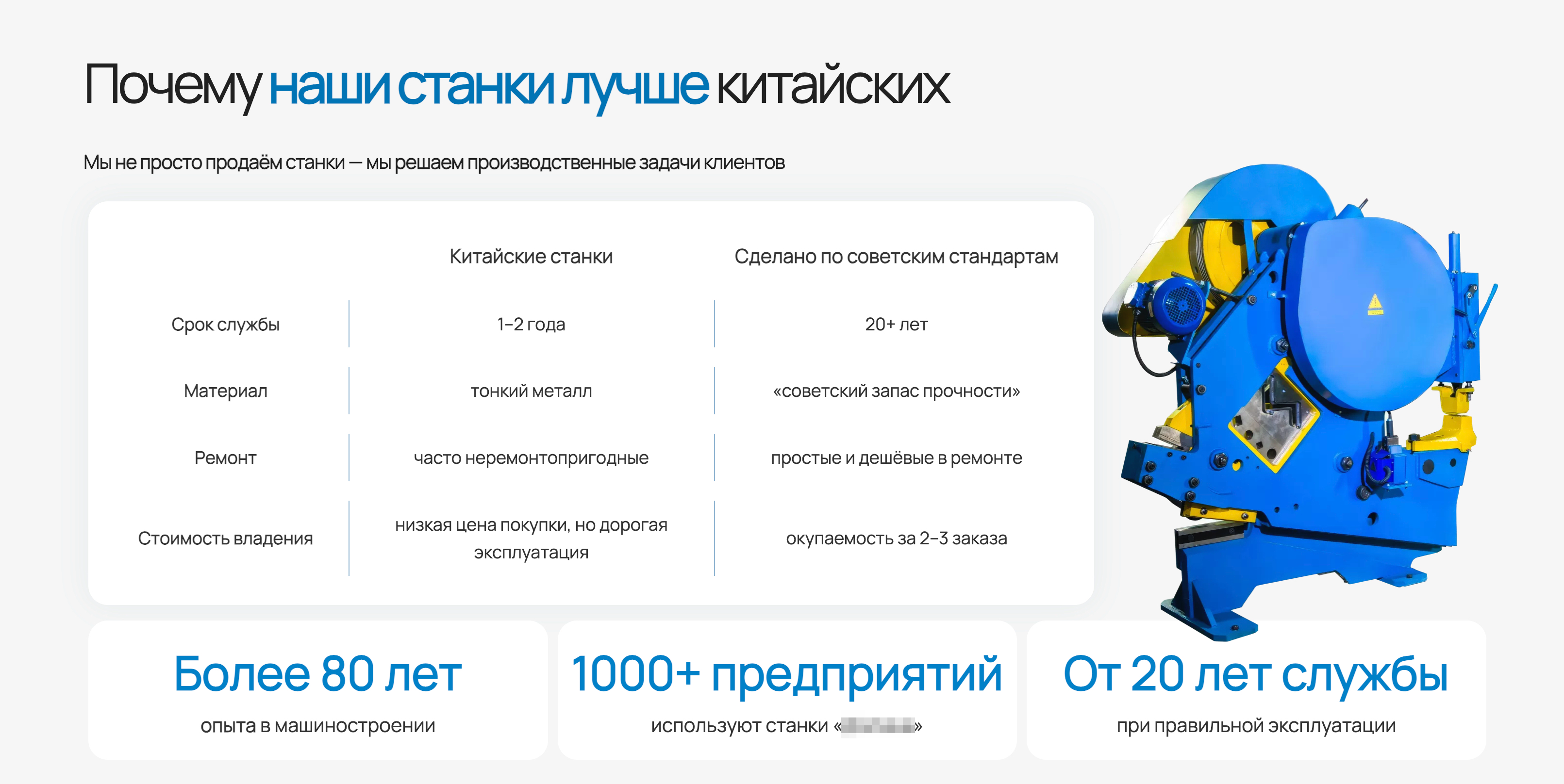 «Почему наши станки выгоднее китайских» — без эмоций, без давления, только конкретные характеристики: срок службы, материал, ремонтопригодность, стоимость владения на 5 лет. Это важно, потому что решение о закупке оборудования за несколько миллионов рублей часто принимается коллегиально: страницу показывают главному инженеру или собственнику. Сравнение должно выглядеть как аргумент, а не как реклама. По сути, этот блок выполнял работу продавца ещё до первого звонка.