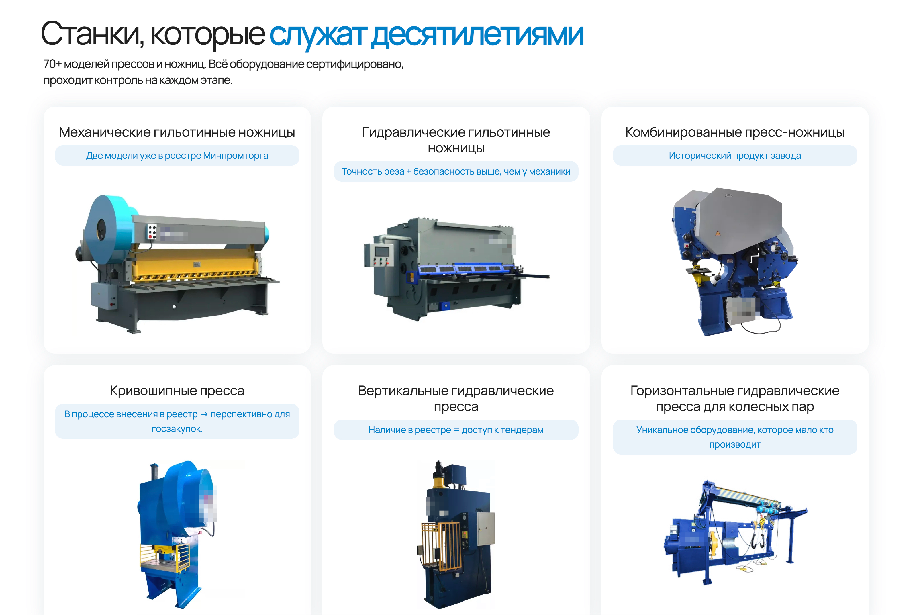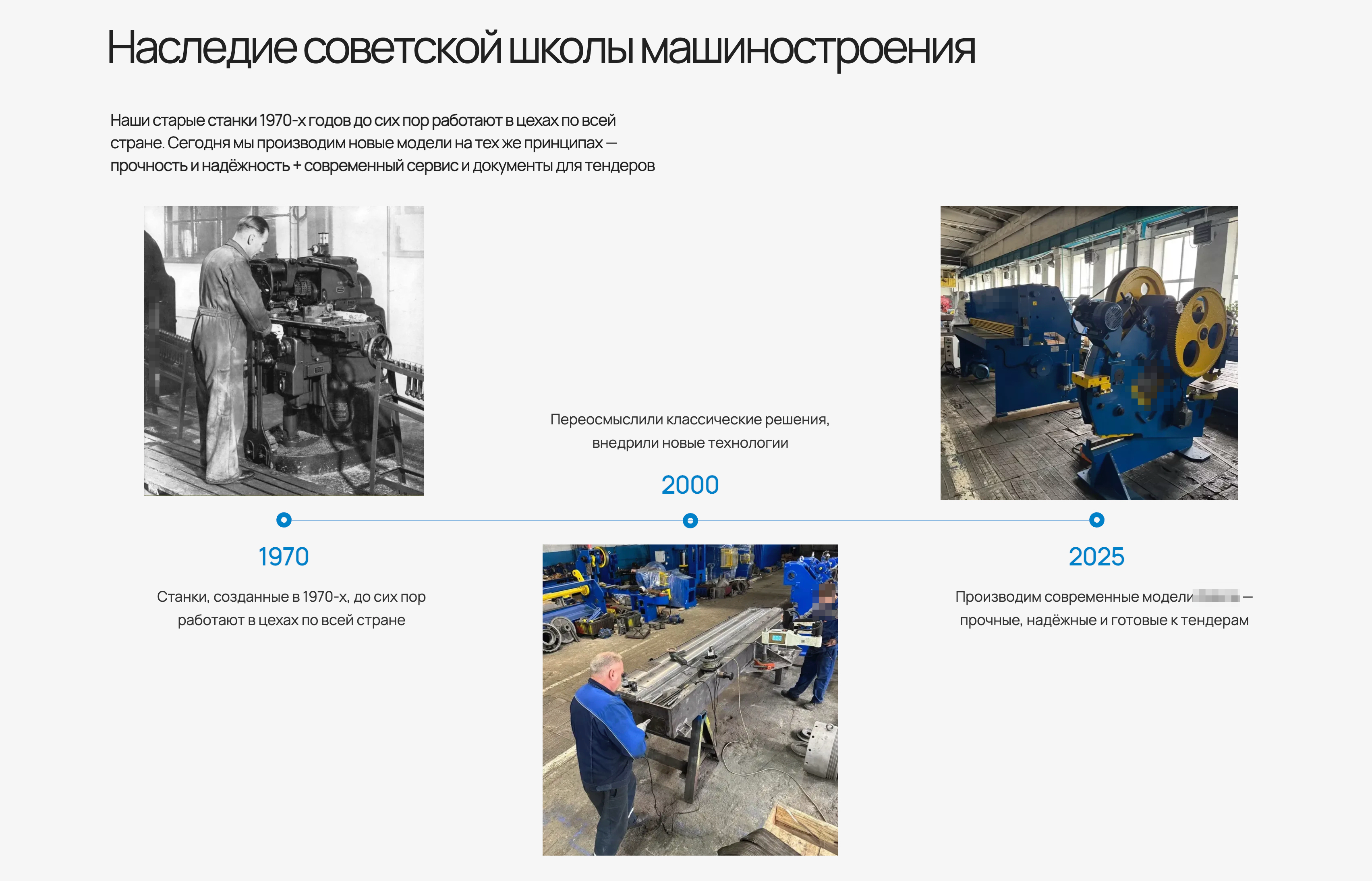 Визуальная временная шкала (от основания до сегодня) показывала: завод не «застрял в прошлом». Современные станки — это развитие, а не копирование. Советская прочность плюс актуальные требования рынка. Для аудитории, уставшей от одноразового оборудования, этот блок сильно усиливал лояльность ещё до первого контакта.
