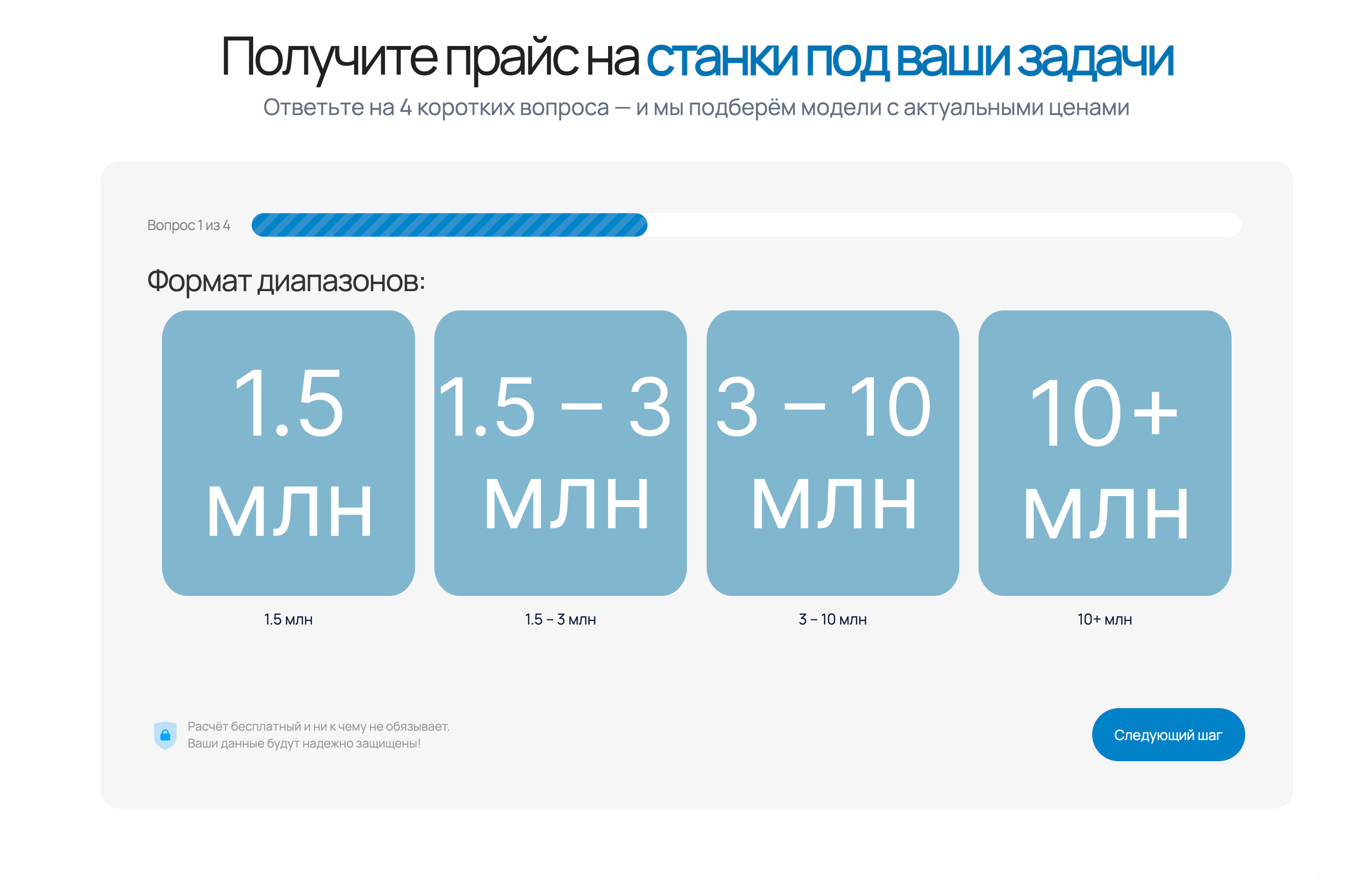 Человек, выбирая диапазон бюджета, сам осознаёт уровень инвестиций ещё до звонка. Менеджер при этом получал контакт с контекстом: не просто «кто-то позвонил», а «директор производства, задача — замена изношенного оборудования, бюджет 3–6 млн ₽». Это принципиально меняет характер первого разговора: он начинается не с вопроса «сколько стоит», а с вопроса «какая у вас задача».