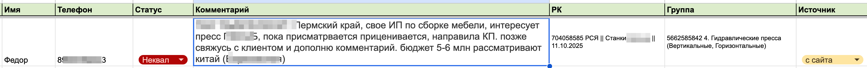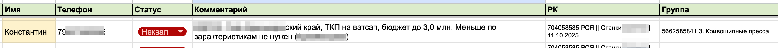 Заявки от предприятий, которые «собирают коммерческие предложения» или «планируют закупку в следующем квартале», массово закрывались как «Неквал» — без попытки выстроить диалог или договориться о следующем шаге. Для покупки оборудования за 3–6 млн ₽ это абсолютно нормальное поведение: человек не принимает такое решение за один звонок, ему нужно время, согласование, расчёт экономики.